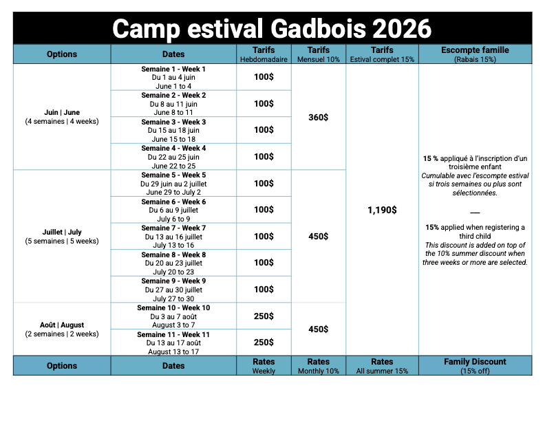 Les inscriptions partent vite — vraiment vite. Si votre enfant veut progresser, bouger et vivre un été rempli d’action plutôt que de rester devant un écran, c’est maintenant qu’il faut réserver. Une expérience stimulante, enrichissante et mémorable l’attend.